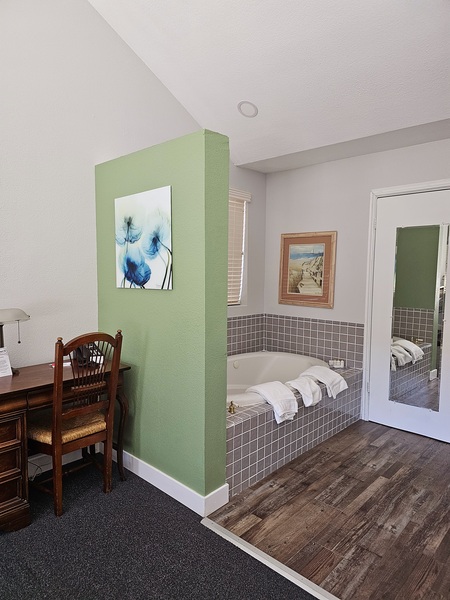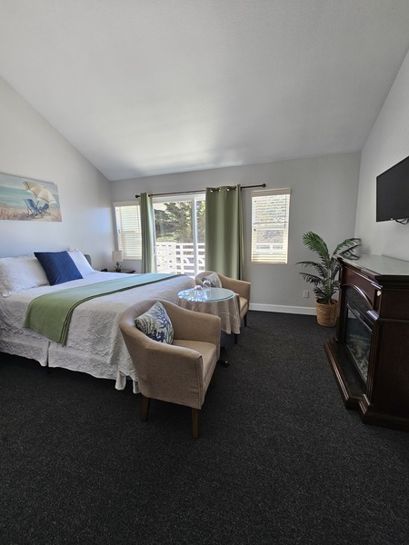 Our Superior Port rooms have a great ocean view. These rooms included ocean views from the balcony, and views of the cove below. The rooms include one Queen bed, Eco-Friendly Fireplace, Jacuzzi, Separate Shower, with ocean view from Private Balcony, television, Alarm Clock, Direct Dial Phone, Hair Dryer, Ironing Board and Iron, coffee maker, and Writing Desk. All rooms have either several steps up or down. There is an option to add a twin size air bed for an additional fee, for a max of 3 people.