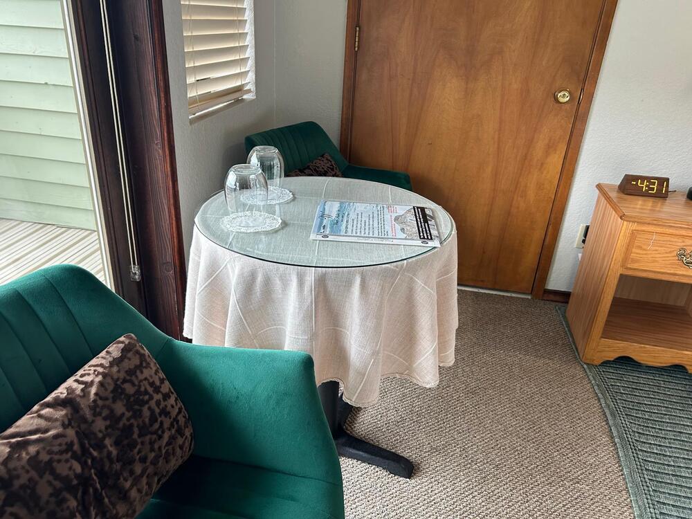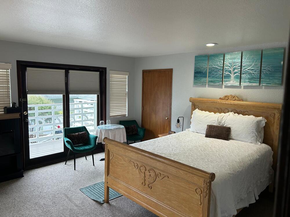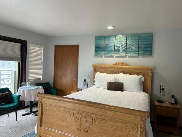 This Queen room is our Standard Room with a private balcony overlooking our courtyard area, and does not have an ocean view. It has one queen bed, mini-fridge, coffee maker, hair dryer, iron/ironing board, television, and microwave. This room does not have a jacuzzi tub. It has a soaking tub with shower. This room is up one flight of stairs. There is an option to add a twin size air bed for an additional fee, for a max of 3 people.
